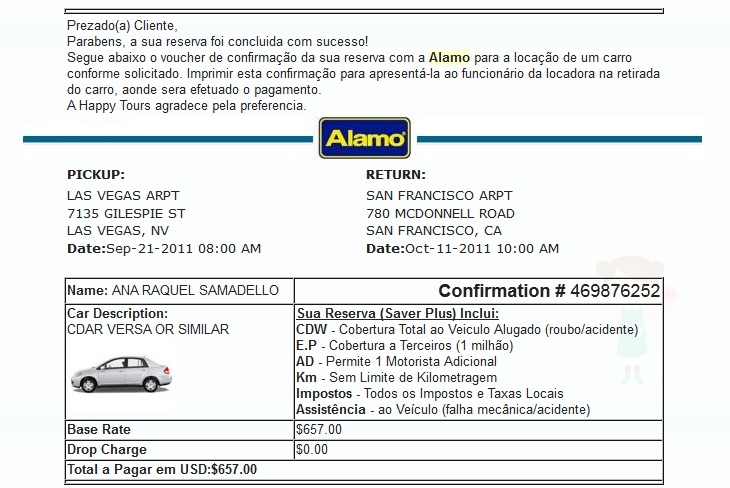 A reserva para 21 dias com devolução em outro estado (isso pode encarecer a locação) ficou, até então, em US$ 657 (com taxas). No nosso caso, não foi cobrado extra pela devolução em local diferente. Para ter certeza que a reserva era quente, acessei o SAC da Alamo e por chat confirmei tudo com a atendente.